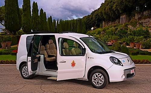 Renault is donating two exclusive all-electric vehicles presented to His Holiness Benedict XVI especially built to meet the Pope's mobility needs. The modified Kangoo Maxi Z.E., part of the company’s Zero Emission initiative was developed in conjunction with French coachbuilder Gruau. The French carmaker also donated another electric vehicle to the Corps of Gendarmerie of Vatican City, the holy city’s guards. Is the Vatican turning green? You can read more about Renault’s electric vehicle strategy here: Two Different Electric Car Strategies With Peugeot And Renault.