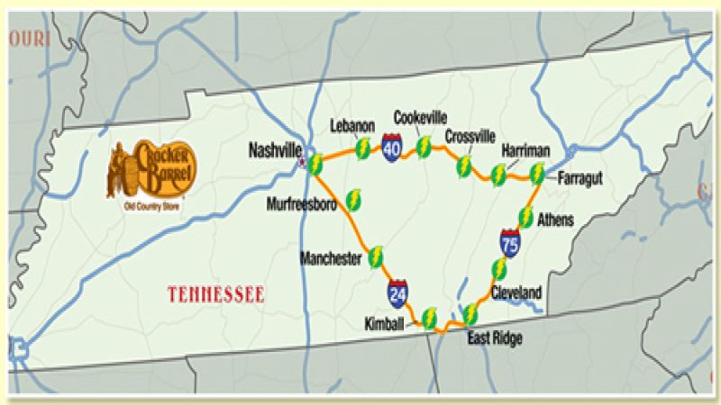 Twelve of the 24 Cracker Barrel locations that will have chargers installed have been identified. Located along the Tennessee Triangle, these locations will support EV drivers traveling along the corridor connecting Nashville, Knoxville, and Chattanooga: