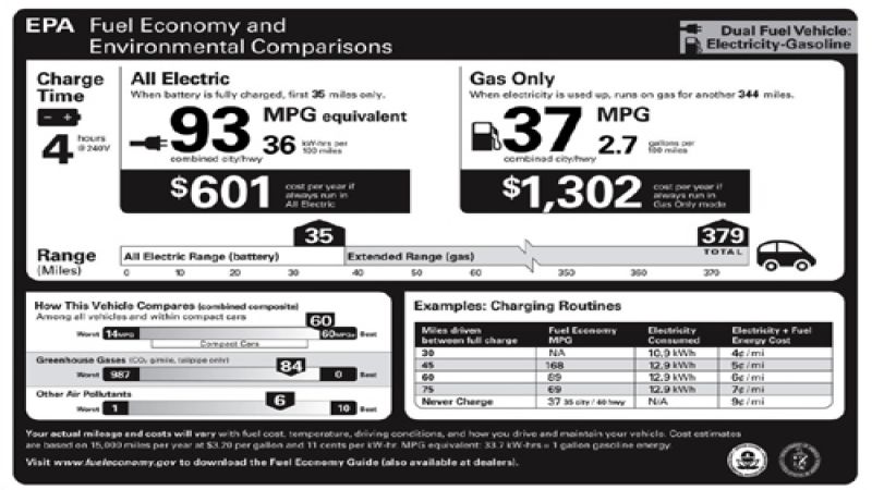 The fuel economy label also shows what type of fuel economy you get based on how often you charge the Volt, which can be recharged at home. Drive 45 miles between charge and your fuel economy number works out to 168 mpg. At 60 miles, it is 89 mpg and at 75 miles it is 69 mpg. Your electricity and fuel cost is also computed on the new label. At 45 miles between charges, it is 5 cents, at 60 miles it is 6 cents and at 75 miles it is 7 cents.