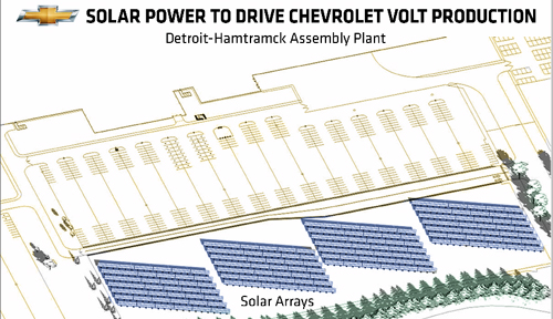 According to a GM press release, the 516-kilowatt project, announced Wednesday by GM and DTE Energy, will generate electricity capable of charging 150 of the electric cars with extended-range capability every day for a year – a total of 54,750 Volts. The 264,000-square-foot project is expected to be completed at the end of the summer and will save the facility approximately $15,000 per year over the 20-year easement agreement. The Detroit-Hamtramck facility was chosen because it has available space for the array and because it is home to the Volt.
