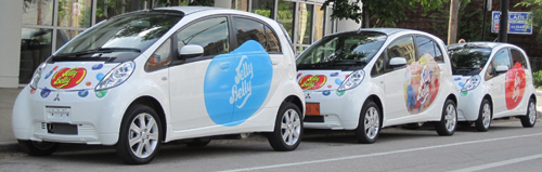 For the 2011 Sweets & Snacks Expo in Chicago, the premier trade show of the candy industry showcasing nearly 500 companies and more than 15,000 confectionary and snack industry professionals from around the world, Mitsubishi teamed with the Jelly Belly Candy Company to wrap four Mitsubishi i electric vehicles in bright Jelly Belly colors.