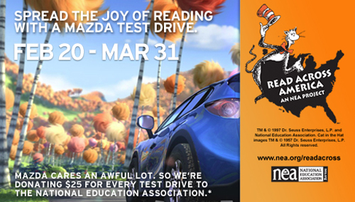 It's all part of Mazda's "Read Across America Tour" in conjunction with the NEA, and Universal Pictures and Illumination Entertainment's Dr. Seuss' The Lorax. That's been a difficult partnership in some aspects for Mazda because of the belief by some that the children's classic should not be commercialized. Of course, the Geissel family would probably disagree with belief because of the longtime financial success it has enjoyed from the Dr. Seuss books.