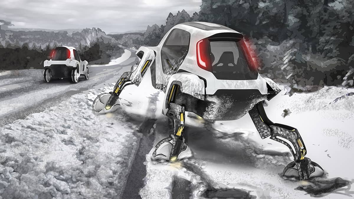 The legs also fold up into a stowed drive-mode, where power to the joints is cut, and the use of an integrated passive suspension system maximizes battery efficiency. Hyundai says this allows Elevate to drive at highway speeds just like any other vehicle. And it will resemble the Volvo C30 Electric while doing so.
