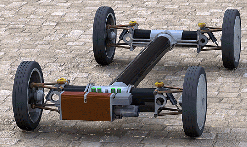 The frame for the INGOCAR is simply an I-shaped tubular form onto which front and rear chassis components are bolted (see photo). The frame and chassis are not only modular, but scalable, so they can be up- or down-sized to create any type of vehicle preferred, from a compact car to a heavy big rig. Inside each wheel is a hydro-propelled motor with reversing valves. These motors propel the car forward or are reversed to act as brakes. When braking, they return hydraulic pressure to the tanks (frame tubes) for future use.
