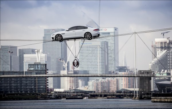 The beautiful new Jaguar XF was unveiled in London yesterday in spectacular fashion. By driving across a high wire above the waters of Canary Wharf in London. Piloted by veteran stunt driver Jim Dowdall, who's appeared in films such as the Bond series, the Bourne series, and even in Indiana Jones. Riding on two carbon fiber wires no thicker than your thumb and with only a hanging Jaguar symbol below for ballast and a simple safety harness in case things went wrong, the XF drove the 787 feet across the Wharf beautifully.