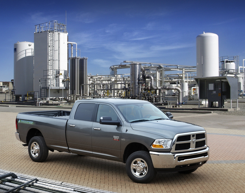 The Ram 2500 will be the first factory-built compressed natural gas (CNG) powered bi-fuel pickup truck. The trucks can run on both CNG and gasoline, giving them flexibility in the field. They are to be marketed to fleet and commercial customers with emphasis on their cost and emissions benefits. Peter Grady, Vice President, Network Development and Fleet for Chrysler Group LLC, says that commercial fleet customers have been asking for a CNG-powered truck and after analyzing fleet sales and customer needs, the Crew Cab 4x4 2500 Heavy Duty was chosen as the best option for the majority of potential buyers.