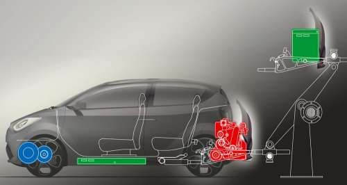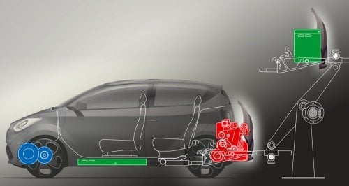 The car is built with a modular engine compartment that can be easily removed and replaced, making for a lot of cool options. Imagine a rear-engine vehicle like the VW Bug that you've backed up to a swapping station, perhaps in the back of your own garage. The automated system detaches your engine and then replaces it with your choice of options (range-extending battery, a fuel cell unit and hydrogen tank, or an empty storage compartment for extra luggage carrying).