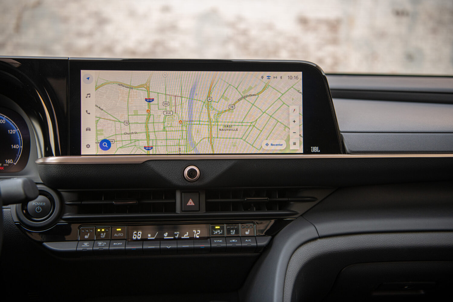 The infotainment system features wireless Android Auto and Apple CarPlay. It worked well in our testing, though we had one or two drops and re-connects. The screen is rectangular and large. Under the screen is a long row of real buttons and switches for HVAC controls. This is ideal. There is a perfect volume knob in the center of the infotainment area, easy to reach for passenger or driver use. We would say this is one of the best systems on the market today.