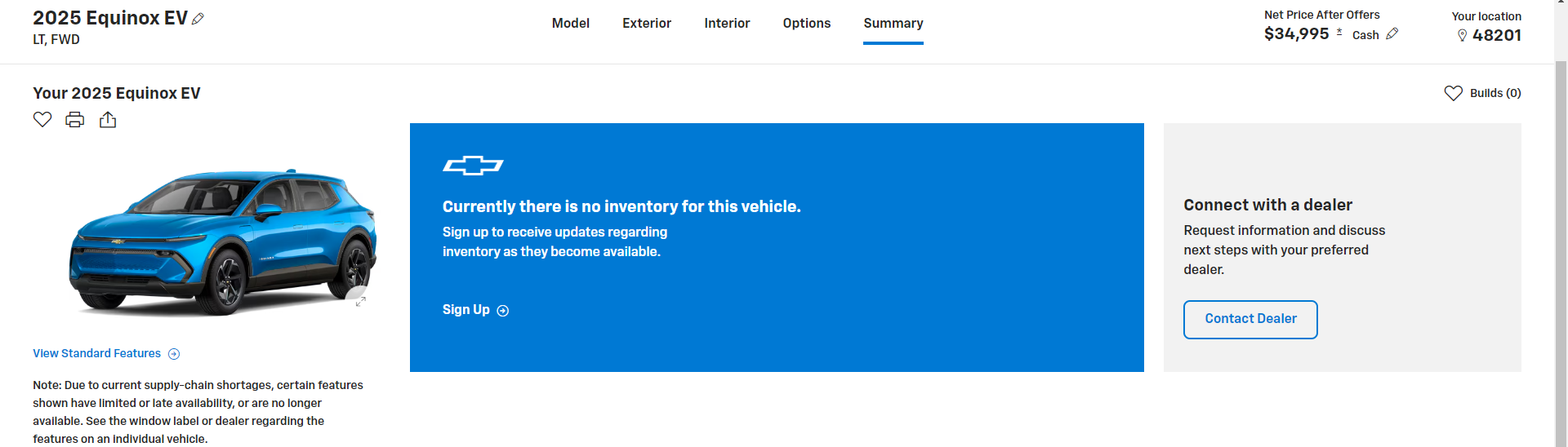 We don't have any confirmation of this, and GM’s public-facing page is still saying there are no Equinox EVs in inventory, but Inside EVs has reported that the $35K version of the Equinox EV is “Shipping to Dealers.” We know that Inside EVs would not intentionally publish this news if they didn’t feel it to be true. Check back at year-end, and hopefully, we will be reporting that GM delivered some $35K Equinox EVs to consumers. As of the publication of this story, the Equinox EVs sold so far has an average transaction price we would estimate at around $48K.