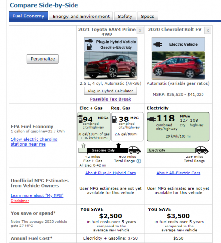 2020 Chevy Bolt Premier vs. 2021 Toyota RAV4 Prime XSE – Real World Cost