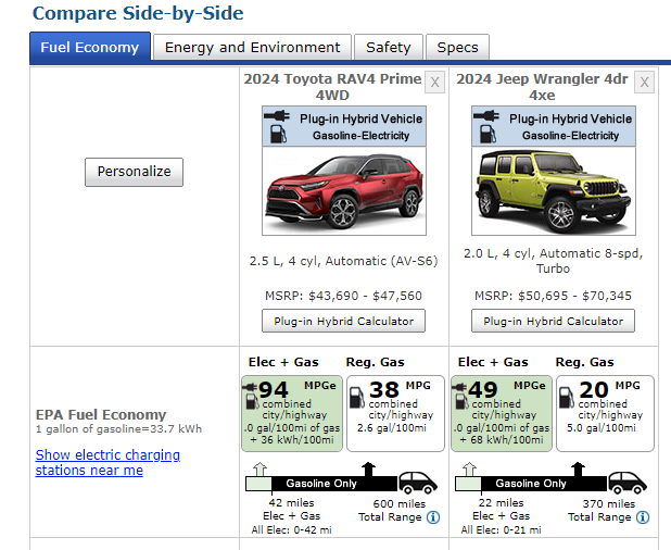 Another reason why PHEVs are better than the majority of battery-only vehicles relates to all-wheel drive. In a blizzard situation, all-wheel drive will carry you farther and in worse weather than will two-wheel drive. The RAV4 Prime has standard AWD. The Jeep Wrangler 4Xe has legendary 4X4 capability.