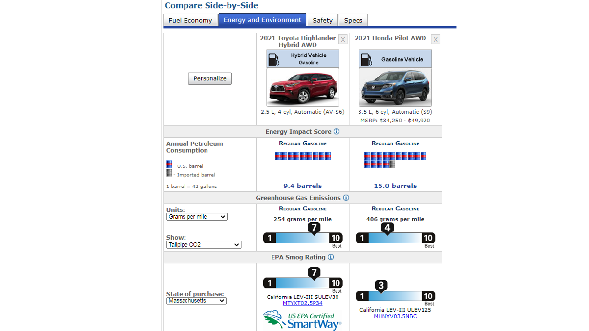 And money isn’t the only thing that the Highlander saves. Over 20 years, it will consume 4,704 fewer gallons of gasoline. The environmental impact of that fuel savings is significant. The EPA scores the Highlander Hybrid a 7 on its 10-point smog scale with 10 being the best score. The Pilot earns just a 3. Over 20 years, the Pilot emits 20 tons more CO2 than the Highlander Hybrid.