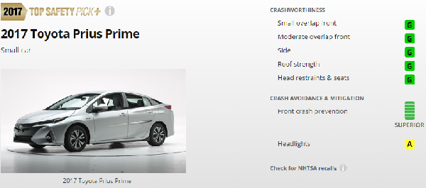 Both the Chevy Volt and Prius Prime did outstanding and each earns the Top Safety Pick Plus designation, the highest rating possible. However, there are a couple of things to note. First, the Volt had higher-rated headlights. The Volt had better low beam results on the left side. That said, the Prime still meets the Acceptable level required for a top overall score.