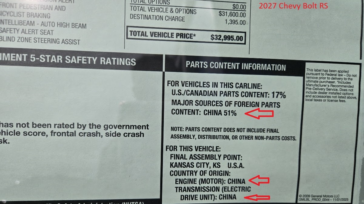 I had the pleasure of driving the new 2027 Chevy Bolt for the first time today. In many ways, the Bolt remains my favorite EV. It’s affordable, fun to drive, practical, and for 2027, the Bolt solves the DC charging challenges the first-generation Bolt had. The biggest surprise for me was its Monroney sticker. Not the part with the price and fuel economy, but the parts content. This Bolt is more Chinese than American.