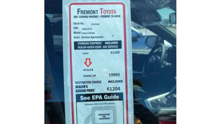 Car dealers across America are adding market adjustments to the MSRP and Delivery Fee prices of new cars to the tune of $20,000. That means that some RAV4 crossovers now cost over $60K. Some Kia SUVs approach $75K after huge markups. Trucks and sports cars are not immune as our examples below will illustrate.