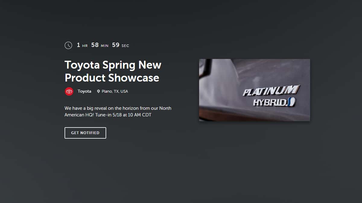 Today at 11 am Eastern Standard Time Toyota will provide fans and shoppers with a look at its upcoming products. Included in that reveal will be two "all-new Hybrids." We can't wait to see what they are, and we wanted to provide readers with a quick link in case they'de like to watch live.