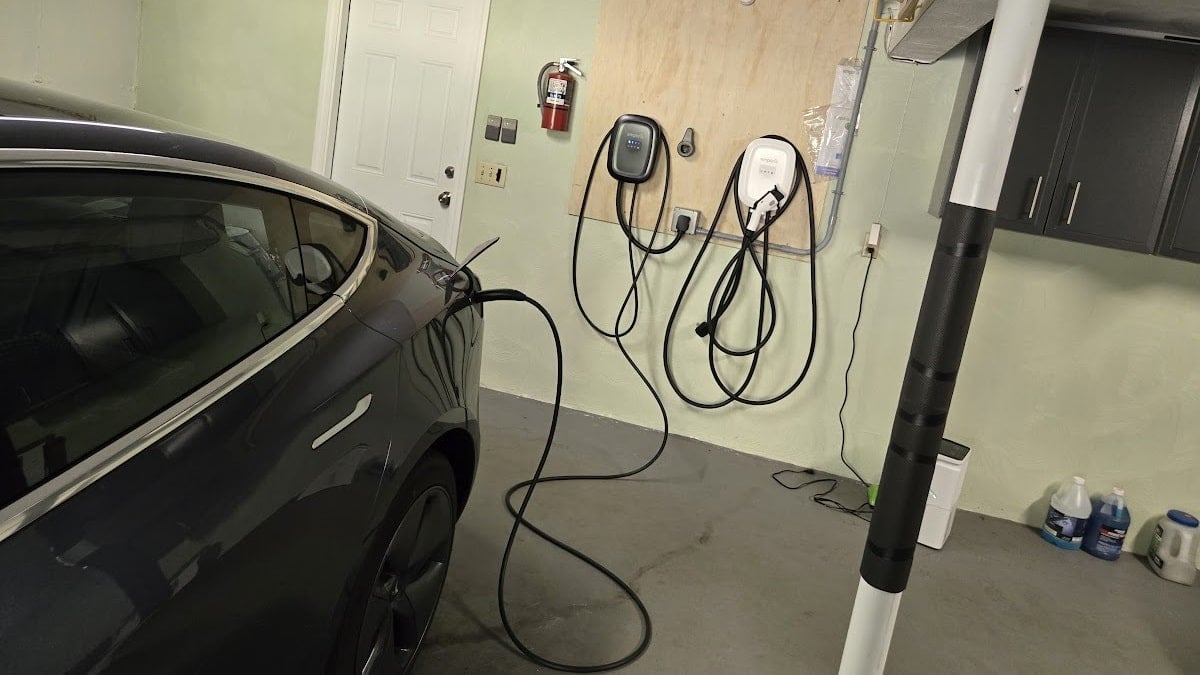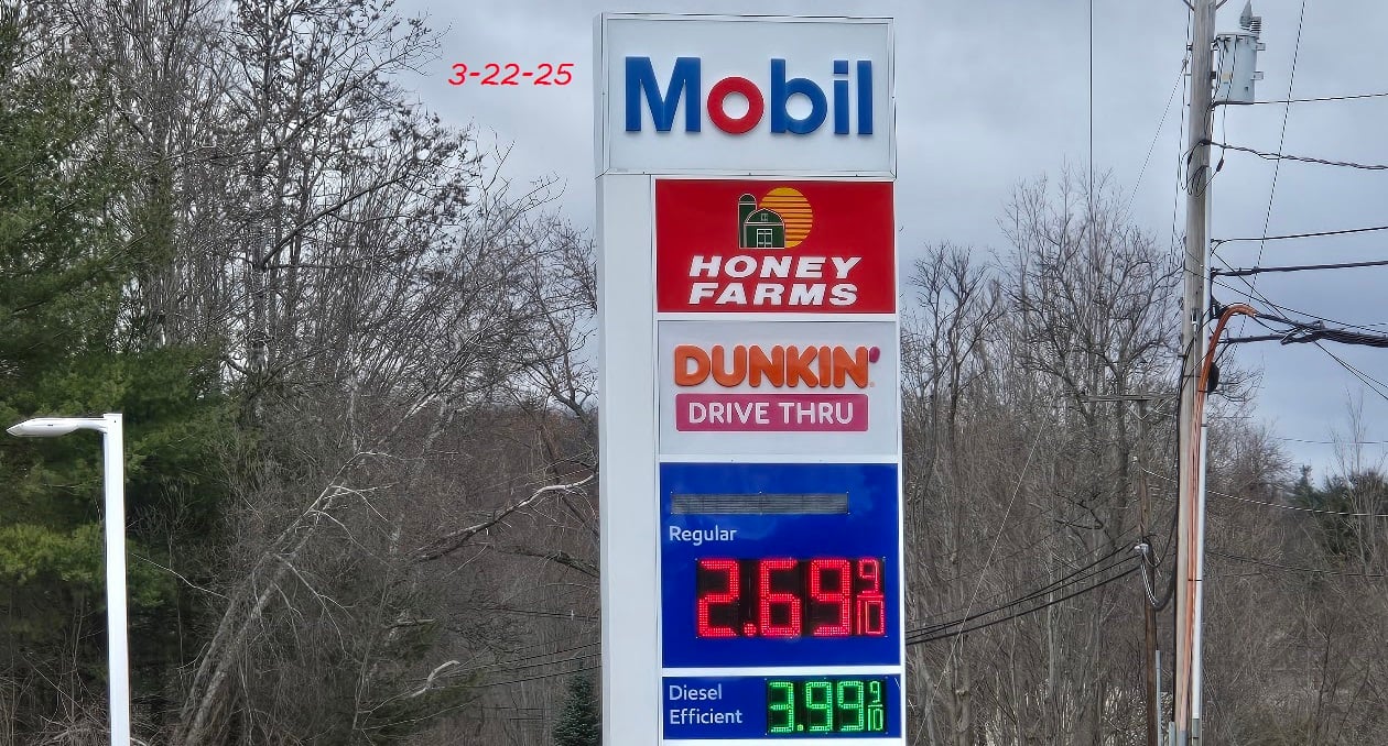 Image of Tesla charging on Emporia EV charger by John Goreham. Screenshot of Tesla email about charging costs by John Goreham - Information courtesy of Tesla, Inc. Screenshot shows AAA national gas prices as of 3-22-25. Screenshot shows GasBuddy national average of gas price March 22, 2025. Image of gas price on 3-22-25 in Lunenburg Mass by John Goreham.