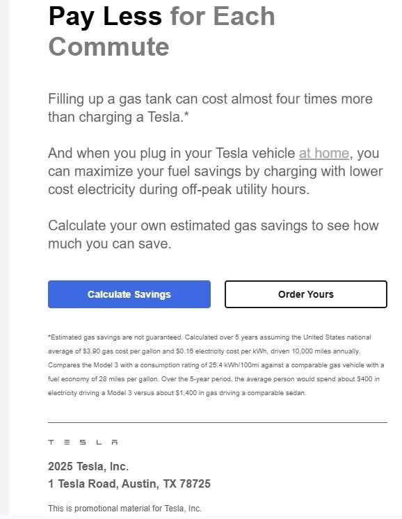 If you live in a state that has very low electricity costs and very high fuel costs, you may well save money by switching to electricity. However, in the area in which I live, the advertisement that Tesla sent me is not just factually in error in two different ways, its underlying premise is also wrong. It is less expensive to power a vehicle at the pump than at home in my garage.