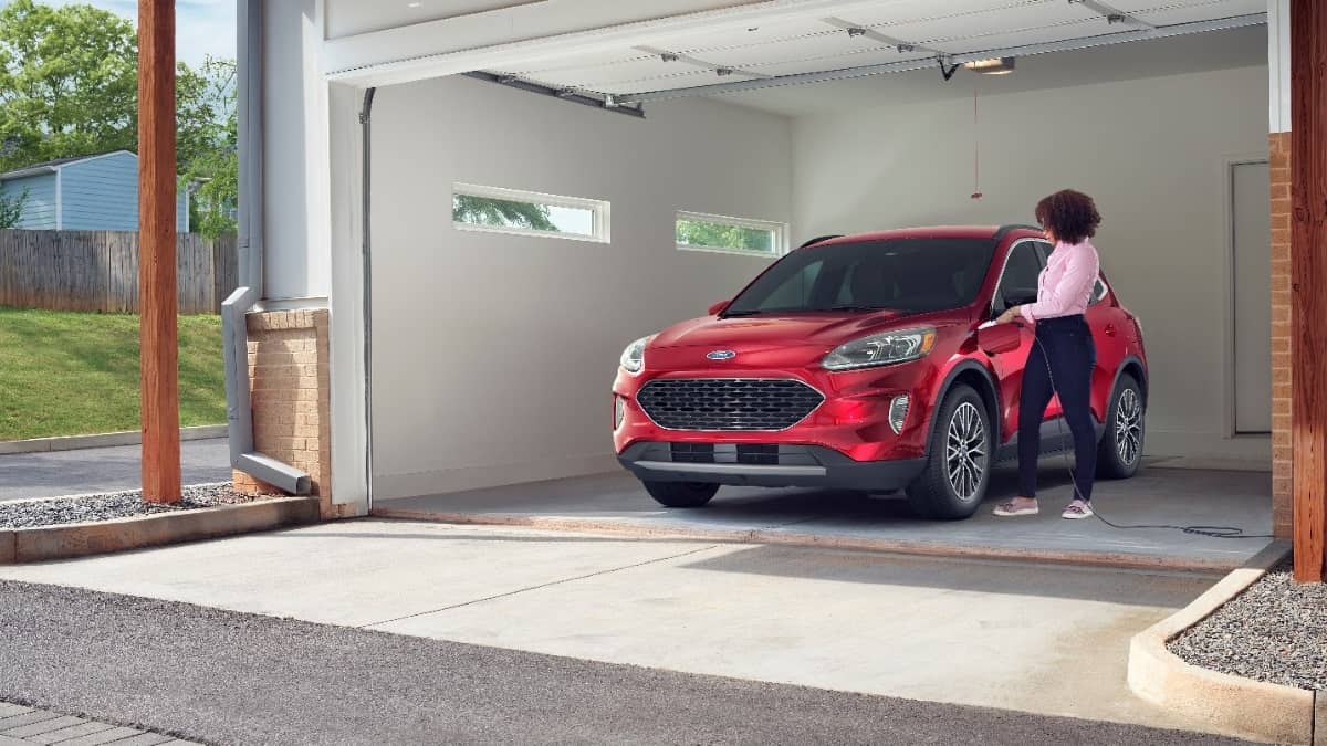 In my normal daily use around town, shuttling a ten-year-old to her various activities, shopping, going to the gym, and one trip to a home improvement store, we were 100% electric. I have a level 2 charger in my house that cost just $199 and it can charge a vehicle like the Escape PHEV up very quickly. For example, it can easily charge the vehicle from zero to 100% battery capacity overnight. More often, I was parking it between trips and charging from about 25% to 100% state of charge in about ninety minutes. As you can see in the image, charging is super simple. My charger is located next to the driver's door in my garage. Ford has a one-touch opening system for the charger port, so even while carrying something in one hand, it's easy to pop open the charger port, grab the handle, and plug in.