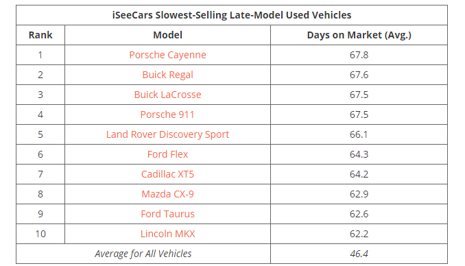The Porche Cayenne has the dubious distinction of the vehicle that takes the longest to sell. Rather than an indictment of the Porche's quality or desirability, Ly sees another reason for the Cayenne's slow used car sales rate. “A late-model used Cayenne is one of the most expensive used SUVs on the market with a price of $61,136, and a used 911 is the most expensive vehicle among those we analyzed at $122,124,” said Ly. “These are very high price points for used car shoppers, which could explain why dealers struggle to move them off the lot.”