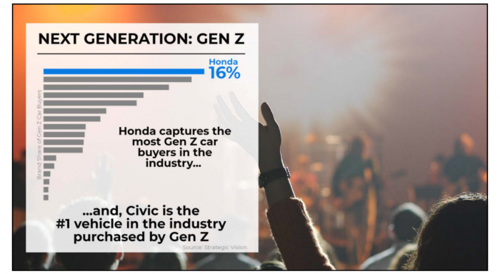 Consider entry sales. These are sales to first-time buyers of new cars. Among the millennial's generation, Honda's Civic is first in sales.