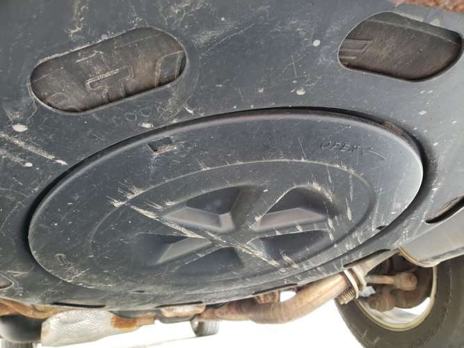 The first step to accessing the spare in a Toyota Highlander is to open the cargo area and look under the cargo floor. There you will find some special tools to enable you to lower the spare tire. Next, lay down a work mat. This is to keep you clean and to help ensure the tire has a landing spot. Next, crawl up under the vehicle (never when a jack is employed) and unscrew the plastic cover.