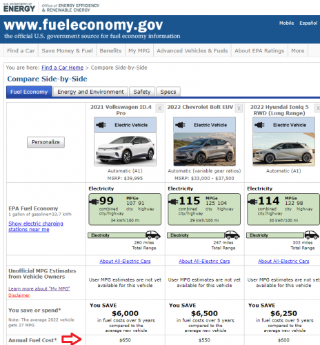 Let’s not drag this out if you are interested in how to quickly determine the approximate costs of your energy for a given EV. Simply go to www.fueleconomy.gov and look up your vehicle. We’ve posted up a handful of models above for you to check out. We opted for three compact crossover-style EVs with an approximate cost to the consumer of around $30K to $35K after incentives, but before dealer market adjustments. As you can see, the difference in energy costs is pretty small, about $100 per year between the various models and brands.