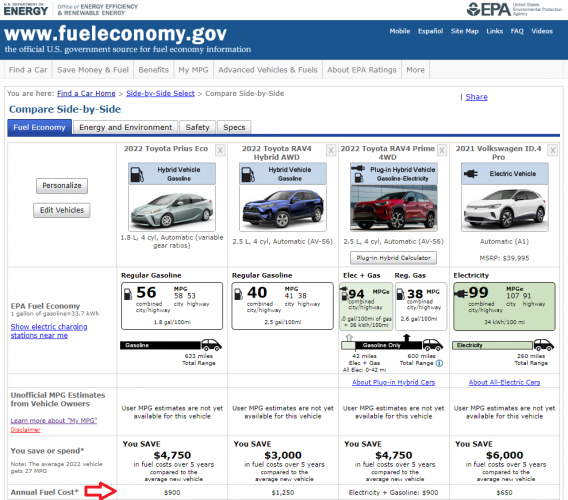 Finally, let’s compare the most efficient option that can accept gasoline, a plug-in hybrid-electric (PHEV) crossover, the RAV4 Prime. Its energy cost per year is about $300 higher than a battery-electric crossover. So, over 20 years, it will cost its owner about $6,000 in energy more than a battery-electric vehicle. Is this a meaningful difference? Many would argue it is if all things were equal. However, a RAV4 Prime has features that no battery-electric vehicle in its class offers. Three simple features that jump to mind are standard AWD, a 600-mile range between needing energy on long trips, and a spare tire in case of emergency. This particular comparison will vary depending on the ratio of electricity to gasoline used by its owner. Many owners primarily use electricity. Some use a mixture with more hybrid miles being traveled.