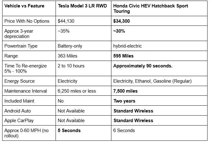 The Civic Sport Touring Hybrid-Electric Hatchback offers wireless Android Auto and Apple CarPlay, a feature package you cannot find in a Tesla Model 3 or Chevy Equinox EV. The audio was very good. Honda and Ford now lead the mainstream brands in audio quality in our book. The infotainment menus are super simple to use.