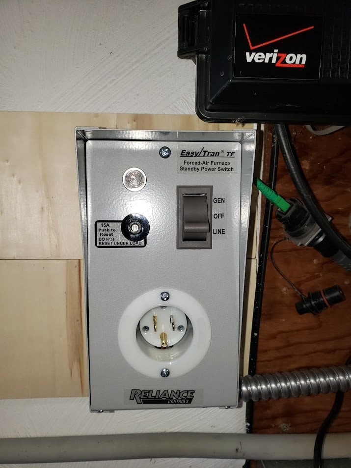So how could one operate their home’s heating system using the Powerbox exactly? The first step is to add a Line-Off-Generator transfer switch. Your electrician can do this for you. Your heating system must operate on 115-volt power for this to work, and most oil burners and gas furnaces do. This switch ensures that you can isolate the power you are putting into the oil or gas burner from the utility line power system. That is necessary for safety. The switches cost around $125, and my electrician charged me just $150 to install it.