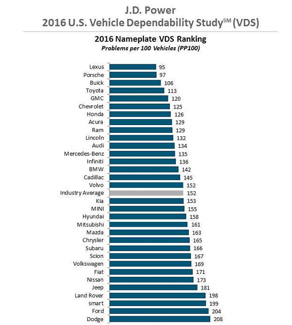 J.D. Power’s Durability Study looks back three years, and again its data is compiled from consumer survey reports. J.D. Power does not meld its test of manufacture-supplied cars with its consumer data analysis but keeps it separate. In its durability report, Lexus is the number one brand with a score of 95 problems per 100 vehicles (PP100). The average overall is 152. Toyota is the top non-premium brand with a score of 113. We would be remiss if we did not mention that Buick (106) does well at both surveys. Audi (134) finished 11th overall in the J.D. Power ranking, and Subaru finishes below average with a score of 166.