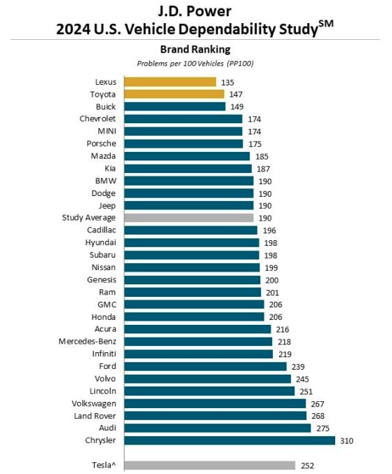 One of the many great studies that J.D. Power publishes each year is the Vehicle Dependability Study (VDS). This study looks at reported problems per 100 vehicles. Unlike many “quality” studies, this one looks at vehicles that are three model years old. We like it because it is a gauge of how reliable and dependable a vehicle is after it is broken in. The study data is compiled from owner surveys.