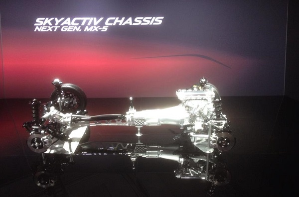 Mazda revealed the 2015 or 2016 MX-5 Miata SKYACTIVE chassis today at the New York Auto Show. The information leaked shows a plan for the 4rth generation Miata to have the lowest center of gravity of any Miata. The engine is also moved back, which is amazing since the car was nearly a mid-front engine design in its third generation. Finally, the car is on track to shed 220 pounds. If it achieves that goal, and gets just a slight bump in power, the car will be noticeably faster than the current generation.