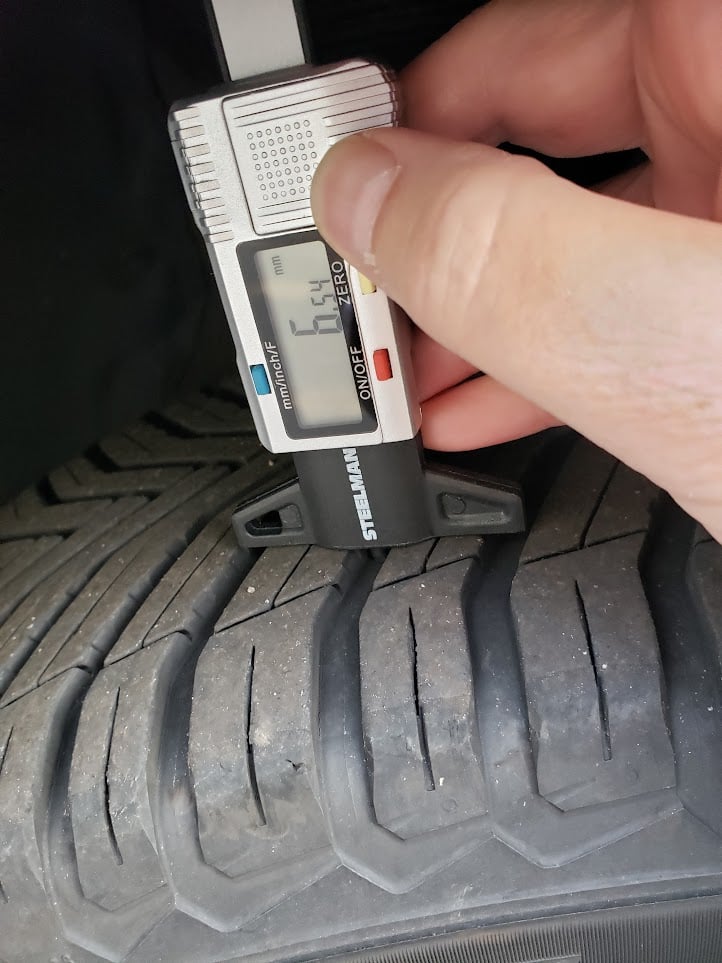When our test tires reached the 22,000-mile marker, we measured the tread depth at 7 mm. Now that we have completed 31,000 miles of driving, the tread depth measures about 6.5mm. There is even wear across all four tire surfaces. We had aligned the vehicle just prior to mounting the test tires, and we rotated them at each or every other oil change interval. The rotations are front to back only because the tires are direction. We recently had the car aligned again at our 60K service visit. These tires are projected to last 75,000 miles at the current rate of wear before reaching the treadwear bars.
