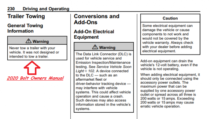 Chevrolet did not include a tow rating for the Bolt Electric Utility Vehicle, so we will assume it is not rated for such duty. The prior generation Bolt included the warning below in its owner's manual.