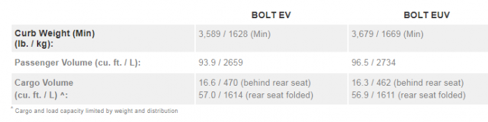 We have cut and pasted the cargo capacity data from the General Motors official specifications for the new battery-electric vehicles above. As it stands, the Bolt EUV has slightly less cargo volume than the new Bolt will. That lower utility volume is found both behind the rear seats and also when the rear seats are folded.