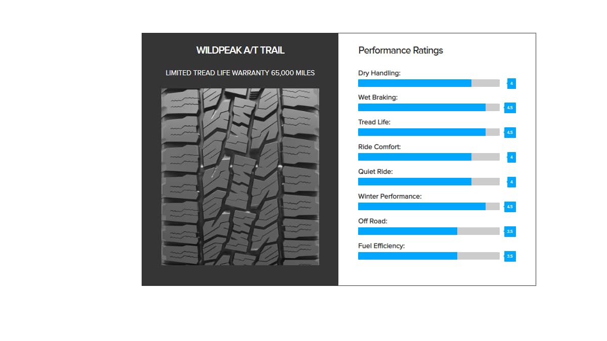 -The Falken Wildpeak tires offer a much more rugged sidewall for greater damage resistance from stones and rocks.