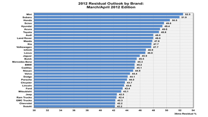The conventional wisdom about automobile residual values is that the premium brands hold their value best. Another common perception is that the Detroit based manufacturers have made big gains in quality and thus, are now holding their value as well as overseas rivals. In a recently issued report on 2012 residual value, ranked by automaker, ALG shows that these assumptions may be more wrong than many would imagine. ALG, based in California, has been providing residual value information to the auto industry and auto analysts for over 45 years.