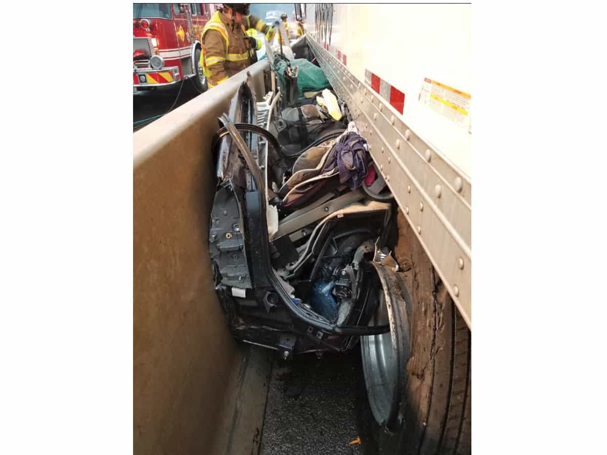 According to the Denver Fire Company, ten rescue vehicles responded to the scene. The occupants were found trapped inside. The crash reportedly started when the female driver of the Toyota Prius lost control of the vehicle while attempting to pass the big rig. Lancaster Online says, "The Prius struck the truck, a Freightliner, and both hit the concrete barrier near mile marker 281.6. The vehicles came to a rest with the Prius trapped underneath the truck, according to state police." The driver of the Prius was cited by police for not traveling at a safe speed. The occupants included a four-year-old and a one-year-old child.