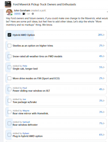 “Hey Ford owners and future owners, if you could make one change to the Maverick, what would it be? Here are some poll ideas, but feel free to add other ideas. Let's skip the whole "More inventory and no markups" thing. We know.”