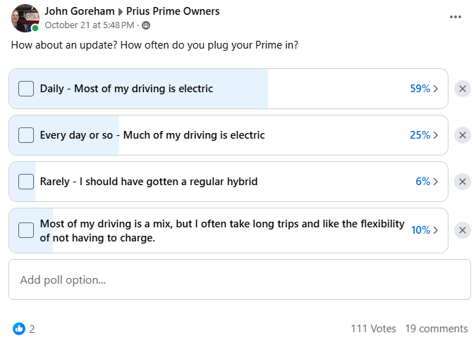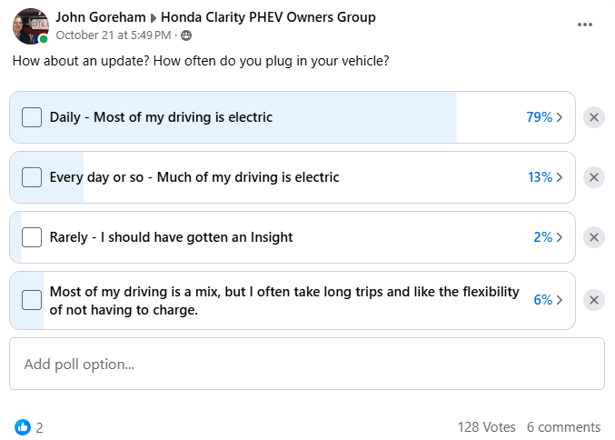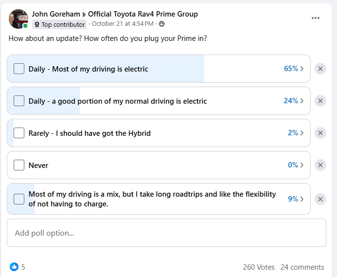 We polled about 25,000 members of three active Facebook Groups. The groups include owners and fans of the Toyota RAV4 Prime, Honda Clarity, and Toyota Prius Prime. All three vehicles are PHEVs. You can see the number of votes in the screenshots that are higher up in this story. We were not looking for volume or details here. What we wanted to find out was what percent of respondents plug in daily and drive mostly on electricity and what percent don’t. You can be the judge of the polling results. This is far from a scientific poll, but if you look at the comments, you can learn a lot about how owners actually use these plug-in hybrid-electric vehicles. What we found in our informal polling matched up very closely with what PlugShare, J.D. Power, and Ford report.