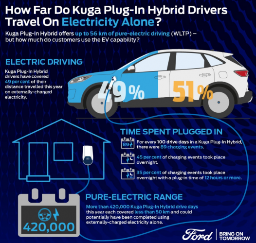 Yes, Ford was one of the first manufacturers to go hard with PHEVs. They did so in Europe, and their top seller was the Kuga crossover, which we know as the Escape PHEV here in America. Ford created the infographic you see above to help answer questions related to how owners use their PHEVs. Ford's data showed that PHEV owners were plugging in 89 out of 100 days. No other manufacturer has released any similar data that we are aware of.