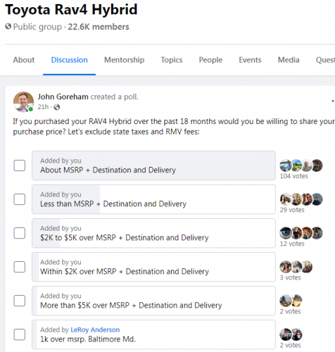 We polled the 22,000-member Toyota RAV4 Hybrid club members on Facebook to see what they said they paid for the vehicle they purchased over the past 18 months or so. The vast majority paid MSRP plus destination and doc fees. Roughly one in four of the respondents say that they paid less than MSRP. About one in ten said that they paid over MSRP.