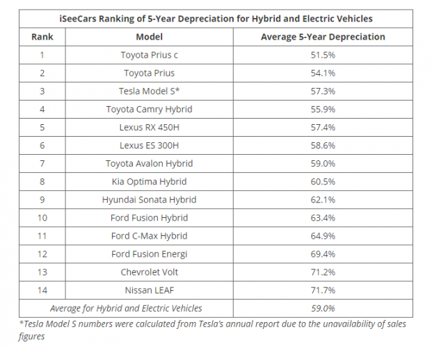 iSeeCars.com analyzed more than 4.3 million new and used car sales to identify models with the lowest and highest loss in value after five years. The study found that the average depreciation among all vehicles was 50.2 percent of its new car asking price after five years of ownership. Another way of saying that is the retained value is 49.8%. For hybrid and electric vehicles, the average depreciation is much higher than for typical vehicles at 59%. “The three highest-depreciating alternative-fuel vehicles are all electrics, making the Tesla Model S the only electric vehicle that depreciates less than the average for the segment,” said Ly. The study concluded that "The Toyota Prius c hybrid is the lowest-depreciating alternative fuel vehicle overall."