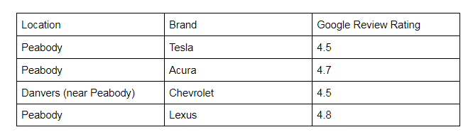 Yelp Reviews For Tesla Dedham, Mass. vs. Yelp Reviews For Nearby Competitors