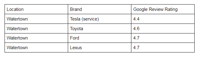 Tesla Google Review Ratings vs. Competitors