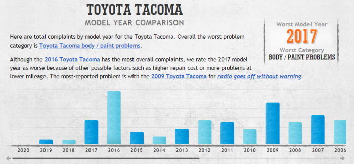 Due to this problem, CarComplaints.com, a website that catalogs owner complaints about vehicles in a graphical format, warns shoppers to avoid the Tacoma. In fact, the site labels the Toyota Tacoma with its "Beware of the Clunker" stamp of disapproval in one model year.