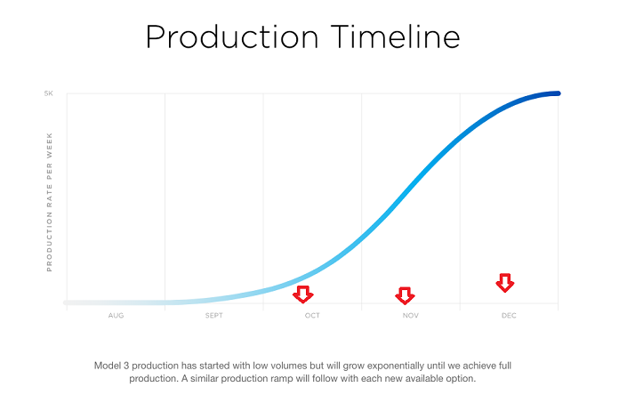 Tesla had promised to be delivering 5,000 cars per week by this point in time. Since July, the company has managed to deliver only 712. The graph with the blue curve above was posted on Tesla's public website as recently as last week. We have inserted the red arrows to show the actual results.