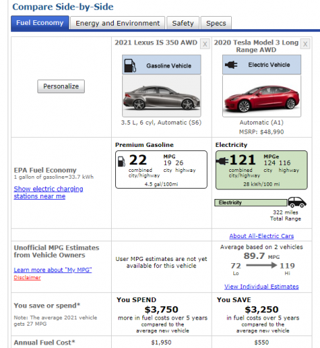 As it would happen, both the Tesla Model 3 Longe Range, Dual Motor, and the Lexus IS 300AWD have prices at just about $49K. So the initial purchase price is the same for the two. And that does not take into account any state incentives the Tesla might benefit from. With its electric drive, the Tesla is also likely to have a lower cost of maintenance and repair. However, we wanted to compare just the prices of the fuel.