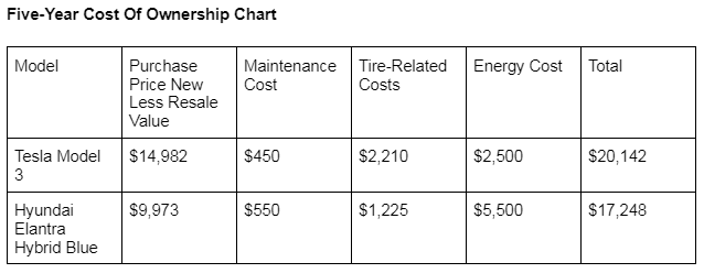 One reason the Elantra Hybrid Blue is so close in cost to the Tesla Model 3 is the dealer markup of $3,000 we assigned. If you are shopping and can find a vehicle without such a dealer markup, your cost model will differ.